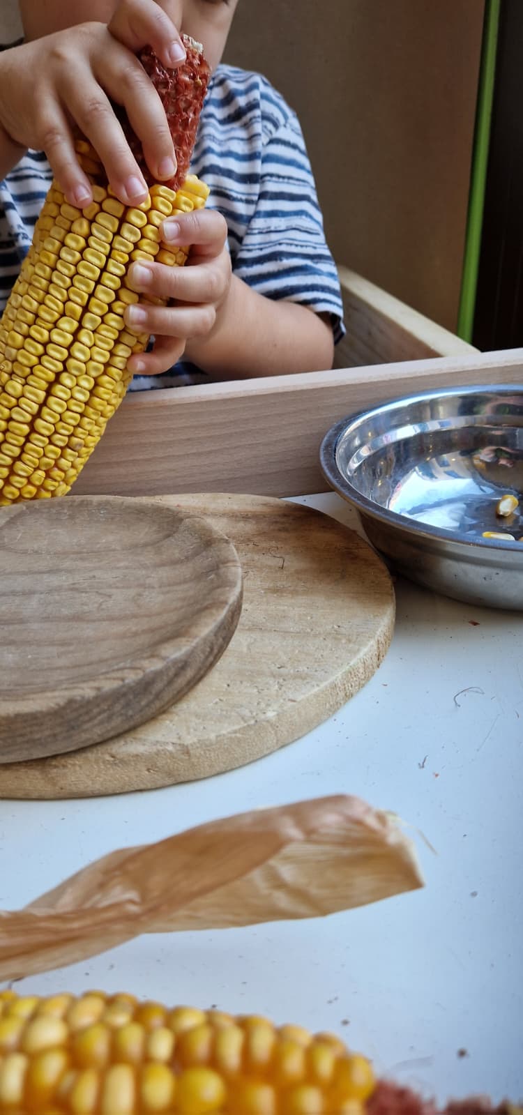 En P s'ha apropat amb curiositat a les panotxes. Primer les ha observat, les ha manipulat amb les dues mans, i ha explorat la textura amb els seus dits. A poc a poc, ha començat a desgranar els grans amb força i concentració, fent servir diferents estratègies per aconseguir-ho. S'hi ha estat una estona llarga, alternant moments de concentració amb petites pauses per observar els grans que deixava sobre el recipient d'alumini.